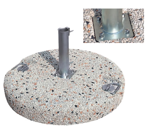 Pied ciment et grès avec poignées de 55kg (diamètre 60cm) fourni avec un tube pour recevoir le mât de votre parasol (diamètre adapté à celui du parasol sélectionné). 2 vis de serrage pour maintenir le mât.